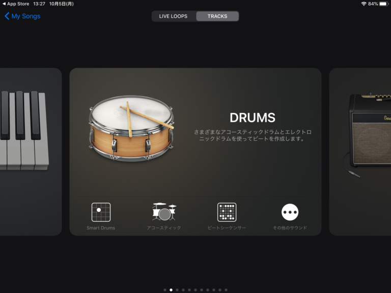 KEYBOARD、DRUM、AMPなどトラックを横スライドで選べる画面で、「DRUM」を選択します。