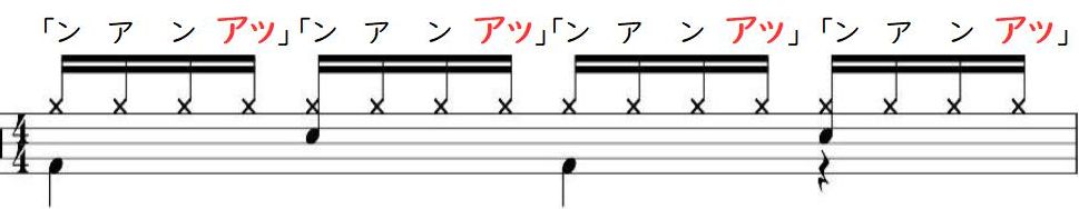 16ビートのノリは、16分音符の裏の音を口ずさみ感じながら、一番最後の音を1拍目に行く推進力とするように「ンタッンアッ・ンタッンアッ」とやると生まれます。