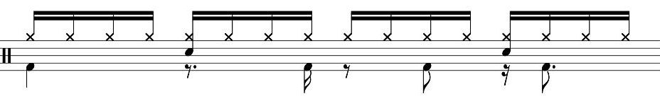16分音符の裏のキック(バスドラム)が初めのうちは難しく感じるかもしれません。