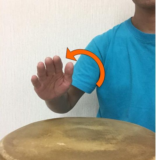 肘を90ぐらいに曲げたまま、軽く横に開き、腕全体を回転させるようにして叩きます。