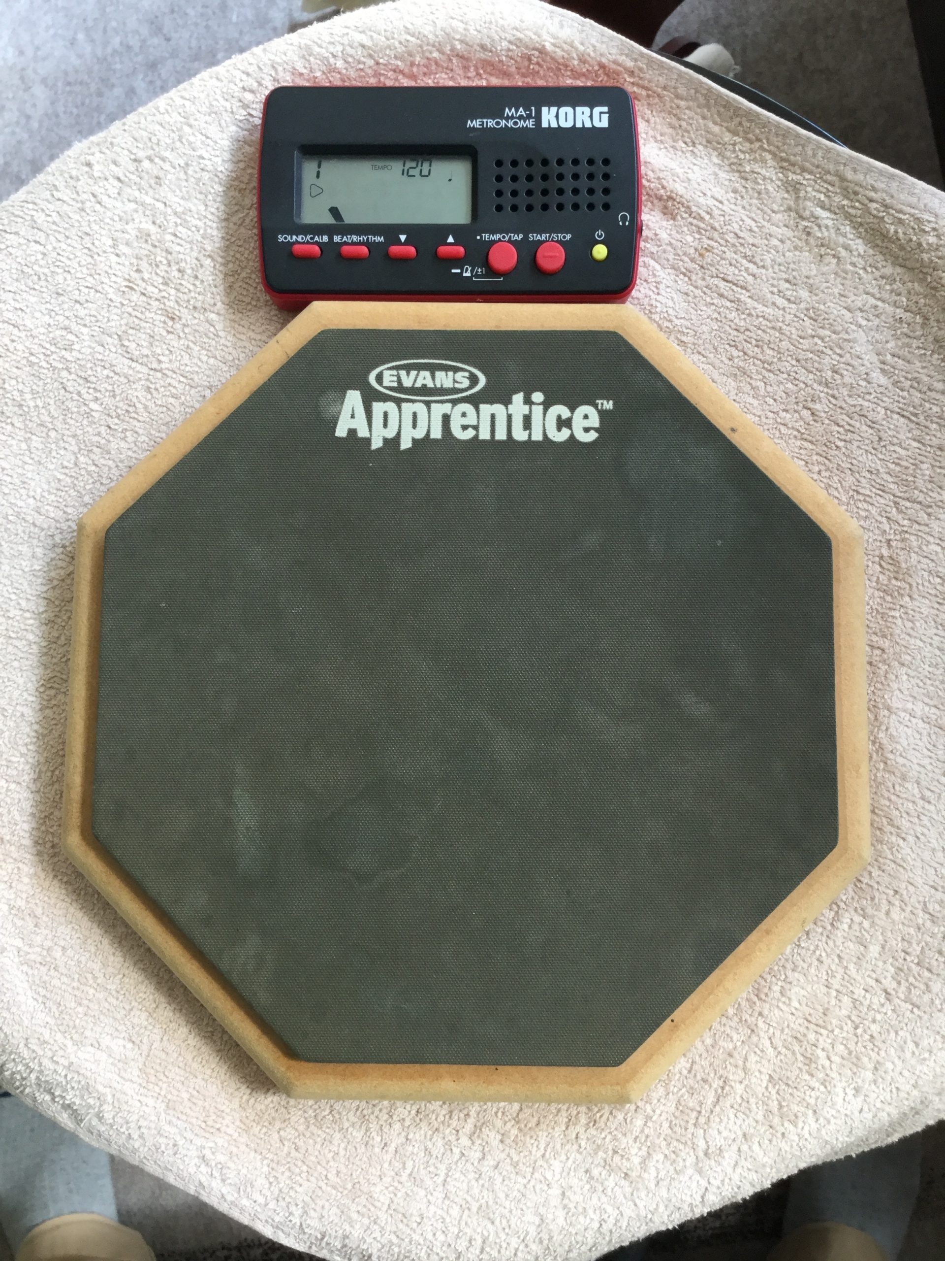 スティックを持たずに太腿の上を、手のひらで叩く練習も効果的です。